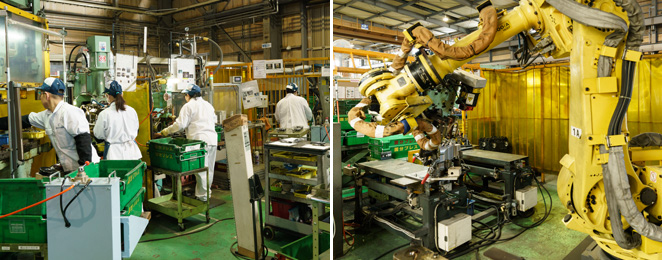 ロボットを導入することにより、作業の高効率化を図っています。スポット打点位置はすべてプログラミングされており、どんなに複雑なスポット打点位置でも、早くて正確な作業が可能です。