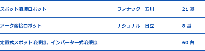 スポット溶接用ロボット、アーク溶接用ロボット、定置式スポット溶接機、インバータ式スポット溶接機、ロボット溶接エリアを構築し、品質の安定と合理化を実現する溶接環境と技術を保有しています。
